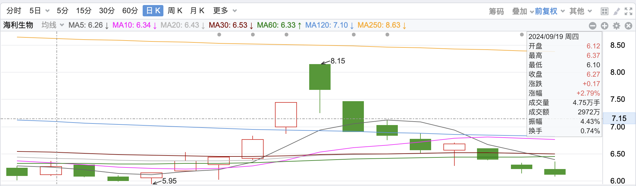 另外,二级市场来看,2024年海利生物股价整体下挫,于2024年7月9日创下近几年新低5.71元/股。同时,“埋伏”海利生物约6年的“牛散第一人”章建平及其家族在9月、10月合计减持近半股票。