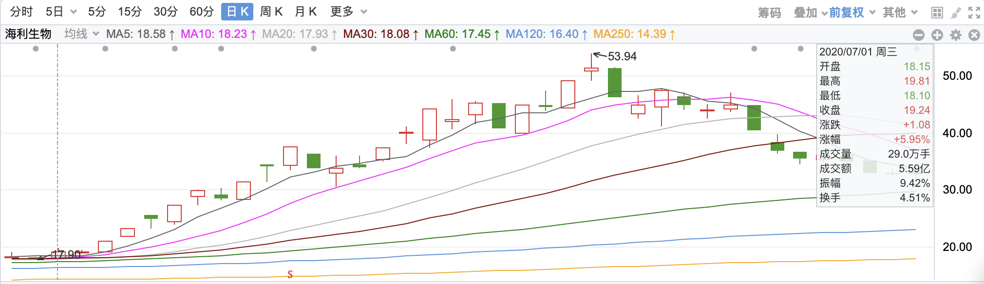 时代周报记者翻阅海利生物发布的简式权益变动报告书以及同期公司股价走势发现,章建平家族增持价格区间约在7元/股-16元/股。而时隔半年多后,即2020年7月开始,海利生物股价走出一轮暴涨行情,由月初的19.24元/股涨到月末的49.03元/股,期间涨幅超过150%,而在随后的8月1号海利生物股价达到上市以来的最高价53.94元/股。