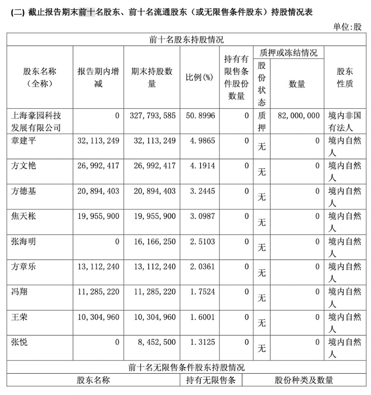 然而章建平及其一致行动人方文艳、方德基、方章乐均未在这一高位区间进行减持。以章建平家族合计持有的109,433,420股,每股53.94元计算,彼时持仓市值高达59亿元。